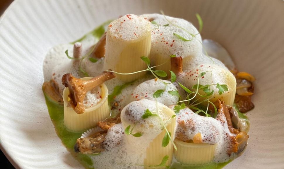 Dans une assiette creuse, dressez le velouté de cresson, ajoutez vos cannellonis bien droits, les garnir de coquillages et de champignons. Émulsionnez la sauce coquillages et déposez-la sur les cannellonis et autour. Ajoutez un peu de persil plat haché et une pincée de piment d’Espelette.