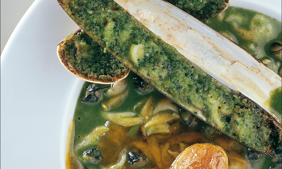 Coquillages au vert, pommes de terre de l’île de ré au beurre demi-sel