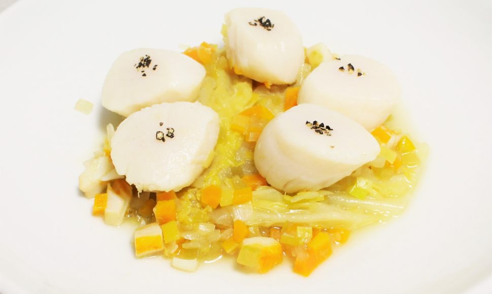Les saint-jacques françaises se pêchent d'octobre à mai, période idéale pour cuisiner ce mollusque à la chair si fine et délicate. Nous vous proposons une version avec une compotée de chou agrémentée de haddock.