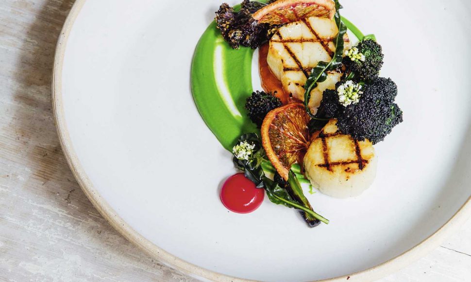 Coquilles saint-jacques, brocolis, orange sanguine et soubressade