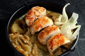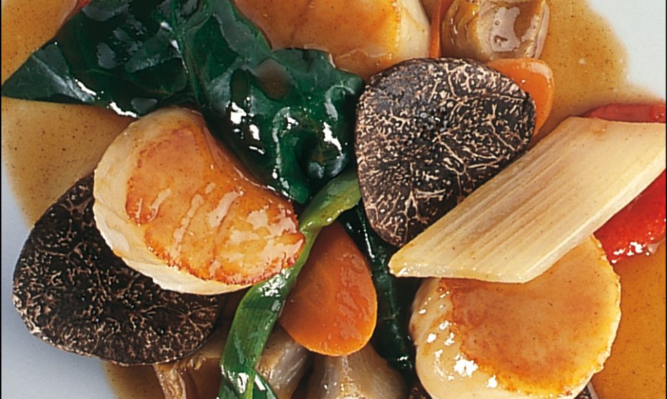 Coquilles Saint-Jacques dorées dans un poêlon, légumes fondants, bouillon réduit, truffes sautées à cru et tomates confites