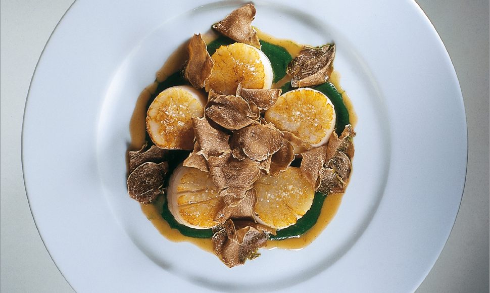 Coquilles Saint-Jacques poêlées, crème de laitue et tartufi di Alba