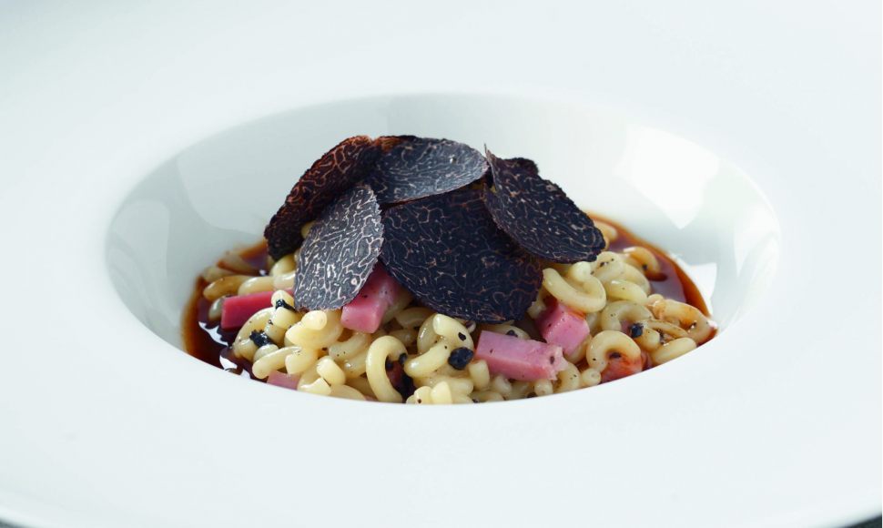 Coquillettes au jambon et truffe noire, jus d’un rôti