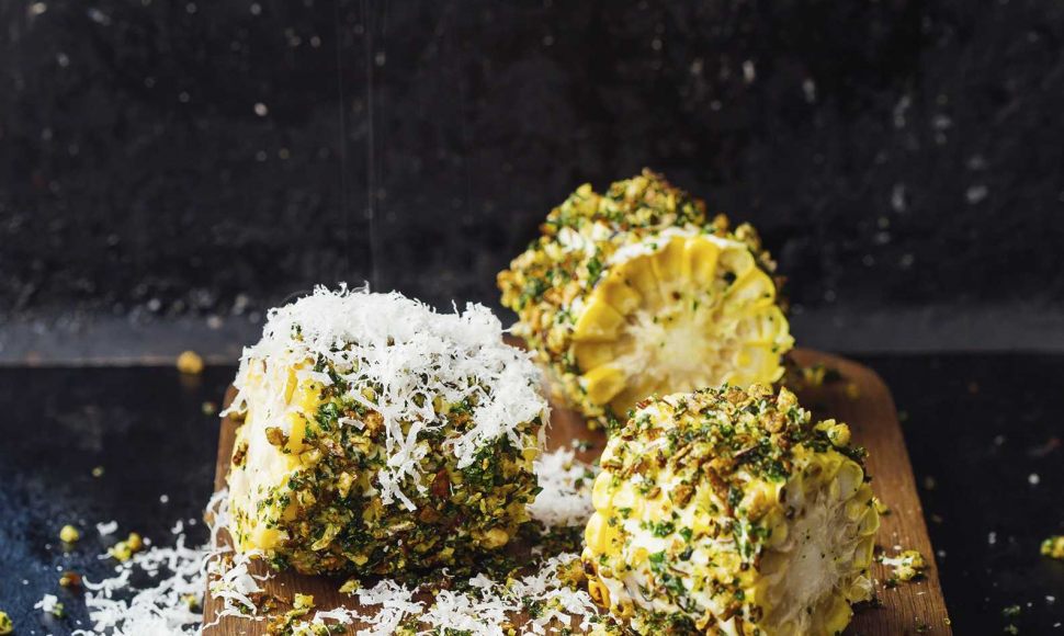 Corn on the cob : maïs, parmesan croustillant, échalotes frites, persil frit, chapelure de maïs.