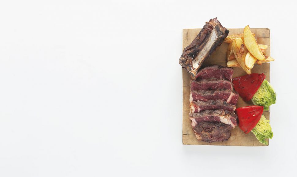 Côte de bœuf cuite à la cheminée, grosses frites, piquillos et ail frit