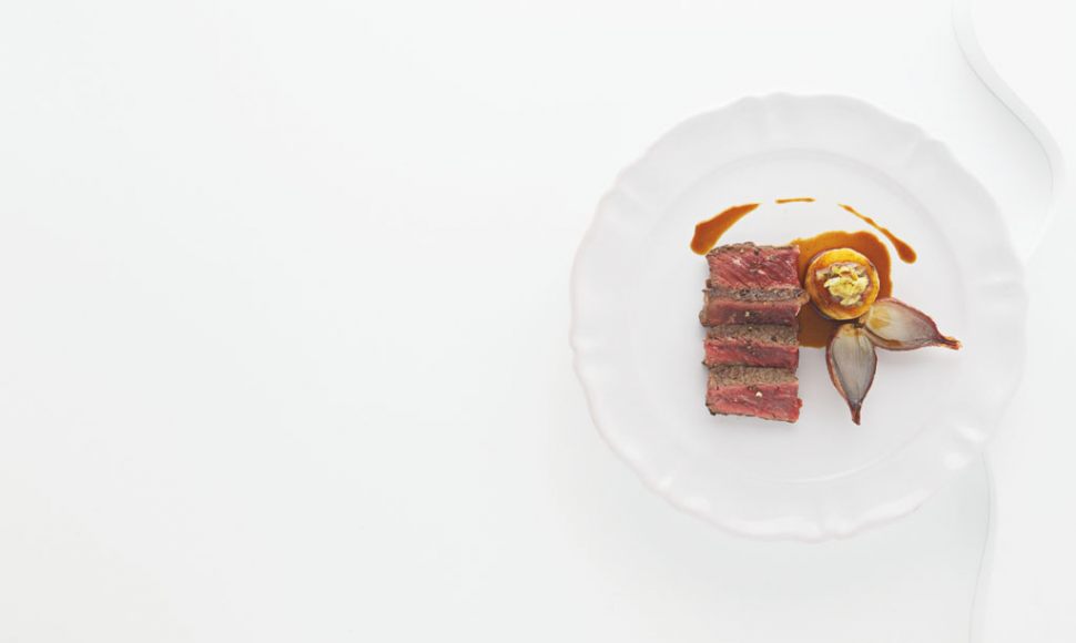 Côte de bœuf du Charolais frottée aux poivres, pommes « os à moelle », échalotes