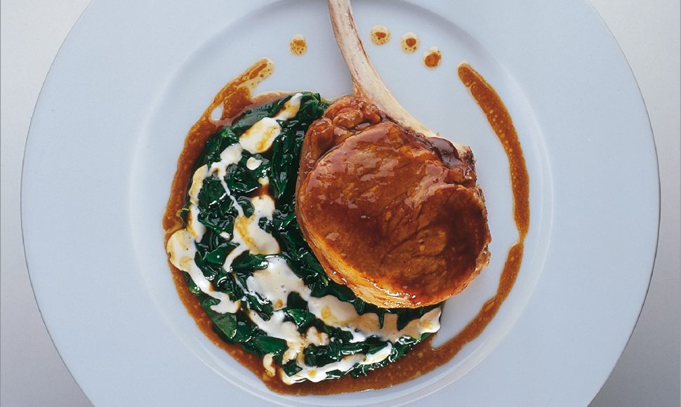 Côte de veau de lait fermier de corrèze rôtie en cocotte, vrai jus de cuisson, épinards en branches très légèrement crémés