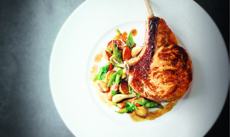 Côte de veau de lait, jeunes légumes fondants à l’ail nouveau