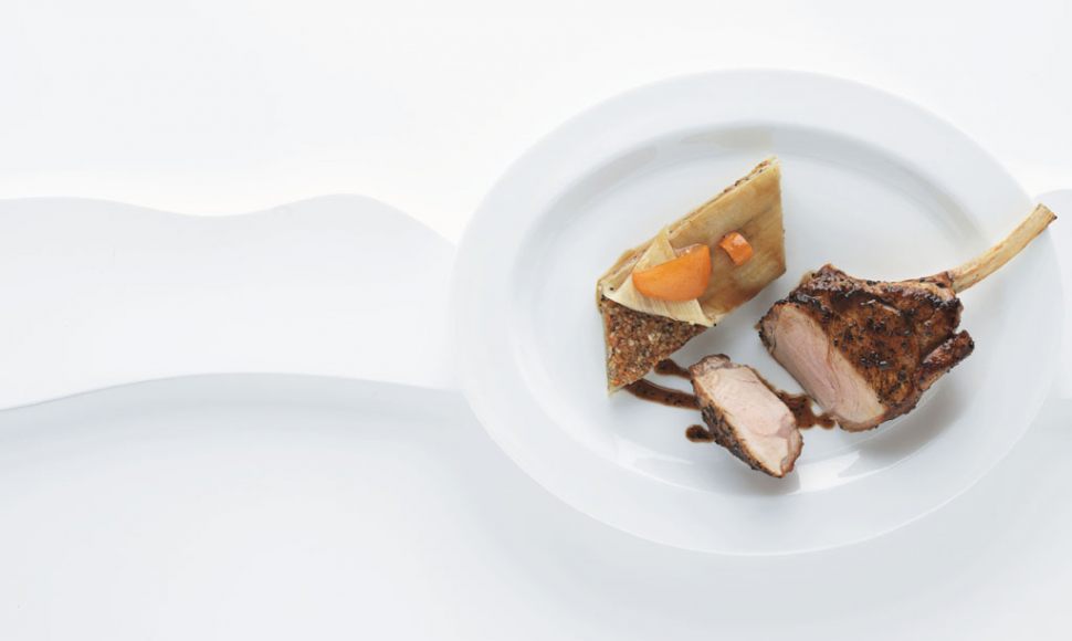 Côte de veau élevé sous la mère au jus, blettes de Nice tartinées de fine matignon puis cloutées d’oranges amères