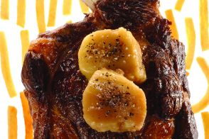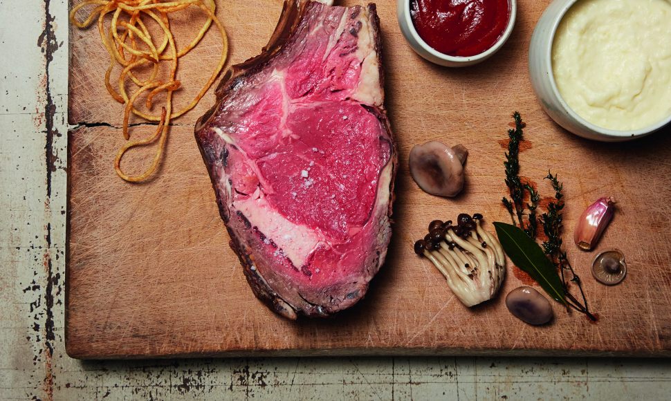 Côte de bœuf du Mézenc, sauce ssamjang, champignons au vinaigre et fils de pomme de terre