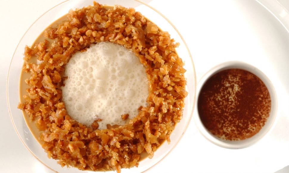 Confectionner la glace au praliné en portant tous les ingrédients à 84 °C au bain-marie. Laisser refroidir à 4 °C, maturer, turbiner et réserver.