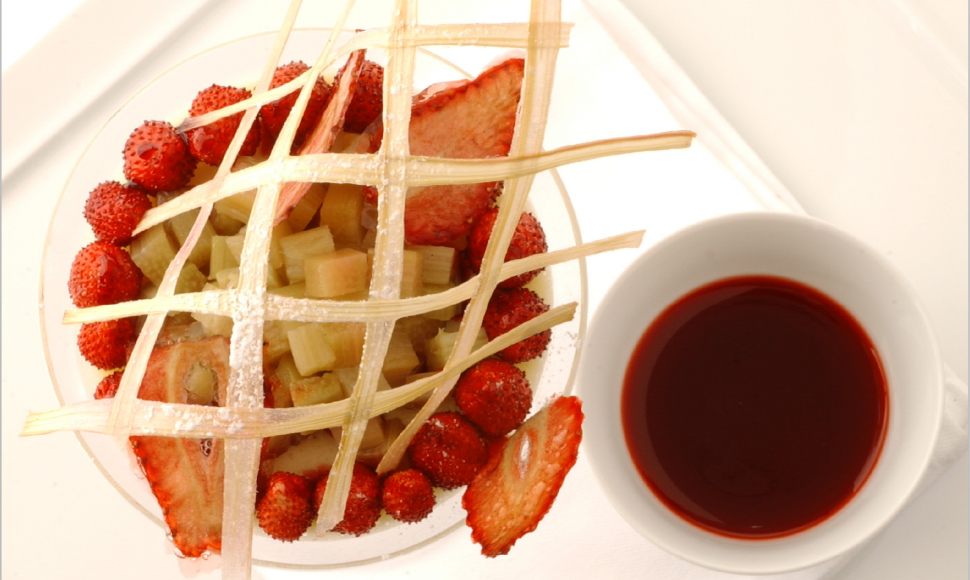 Coupe glacée vanille et compotée de fraise, salade de rhubarbe pochée