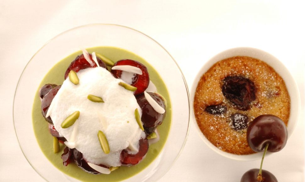 Coupe pistache, cerises fraîches et confites, clafoutis aux amandes et aux griottes