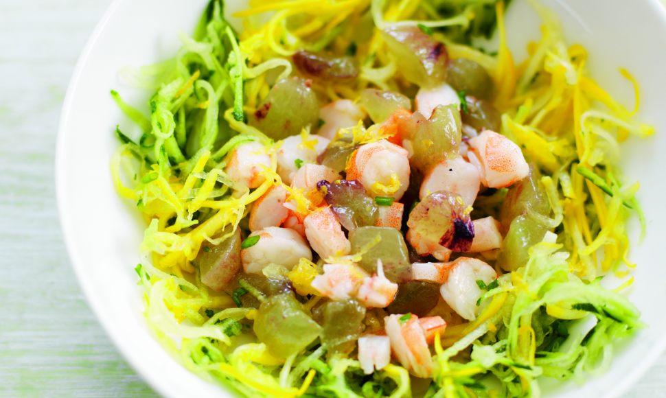 Décortiquez 3 crevettes roses moyennes cuites et coupez-les en petits morceaux. Ajoutez-les dans le bol des courgettes, mélangez. Rincez soigneusement 5 gros grains de raisin blanc ou noir. Avec un petit couteau, ouvrez-les en deux, retirez la peau et tous les pépins, puis recoupez chaque moitié en deux ou trois morceaux.