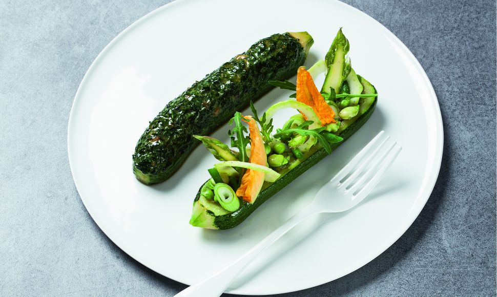 Nettoyez et séchez tous les légumes et toutes les herbes. Taillez très légèrement dans le sens de la longueur les 8 courgettes vertes fines à la mandoline pour obtenir une assise d’un côté, puis entamez l’autre côté à hauteur d’un tiers dans la longueur. Creusez chaque courgette à l’aide d’une cuillère à pomme parisienne et émincez finement toutes les parures pour réaliser la purée.