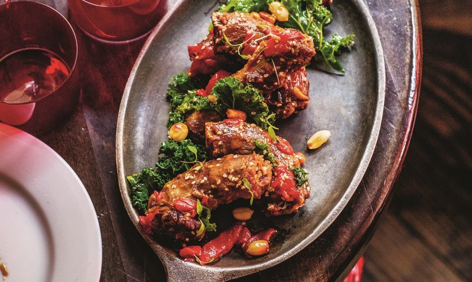« Cela faisait un moment que je voulais servir des cous de canards au restaurant, mais en incitant mes clients à les manger avec les doigts, comme je les ai toujours mangés à la maison. Il ne restait plus qu’à les agrémenter d’une sauce marrante… Je me suis alors souvenu de l’une d’entre elles que j’avais goûtée avec un poulet en Birmanie, à base de sauce soja, piments, ail et vinaigre de riz. C’est ce qui m’a inspiré pour laquer mes cous et leur donner le peps nécessaire. »