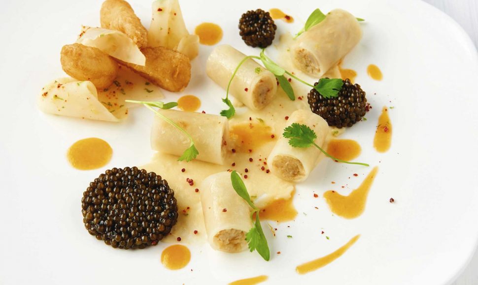Un maki de crabe réinterprété, accompagné de pinces en tempura croustillant et de caviar.