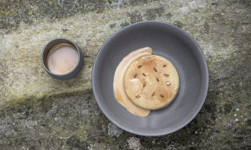 Une crème aux oeufs, un biscuit joconde et du caramel, le dessert qui nous ramène en enfance, servi au restaurant au Clair de Plume.