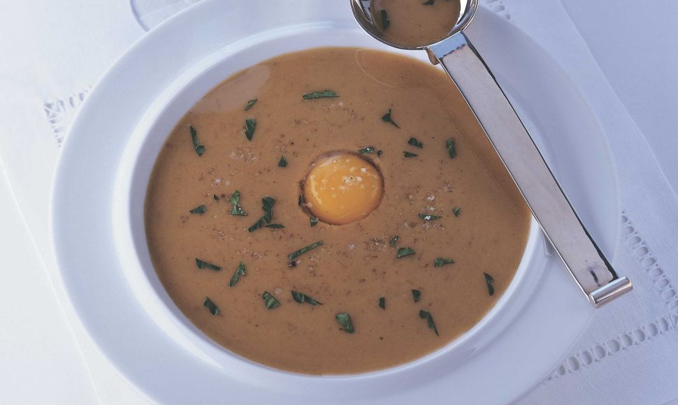 Répartissez le velouté d’ail dans des assiettes creuses.