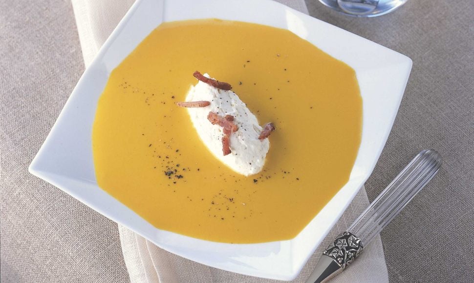 Répartissez-y les lardons et ajoutez une quenelle de crème fouettée.