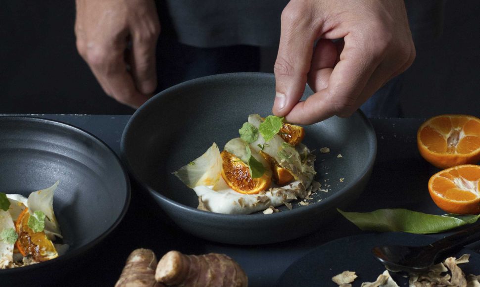 Le topinambour en différentes textures est révélé par l'acidité des clémentines rôties, des citrons verts et de la cardamome. Une recette d'automne vitaminée qui ne manque pas de goût.