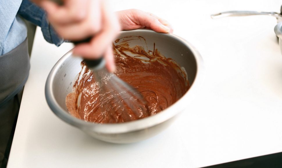 Versez le mélange lait et crème dessus, puis reversez dans la casserole et portez à 85 °C sans cesser de remuer. Hachez le chocolat, placez-le dans un saladier, puis versez la préparation chaude.