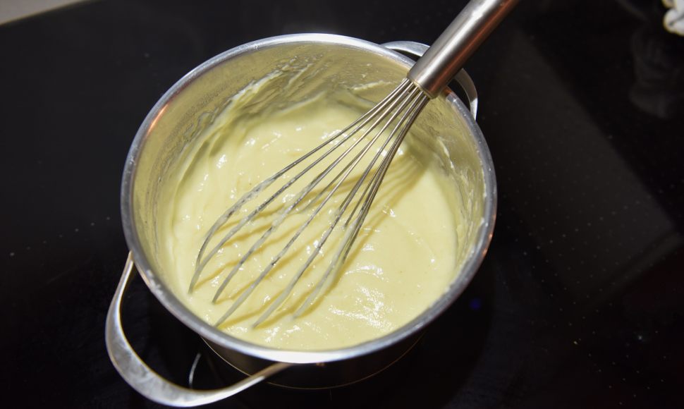 Blanchir les œufs et le sucre, puis ajouter la poudre à crème.