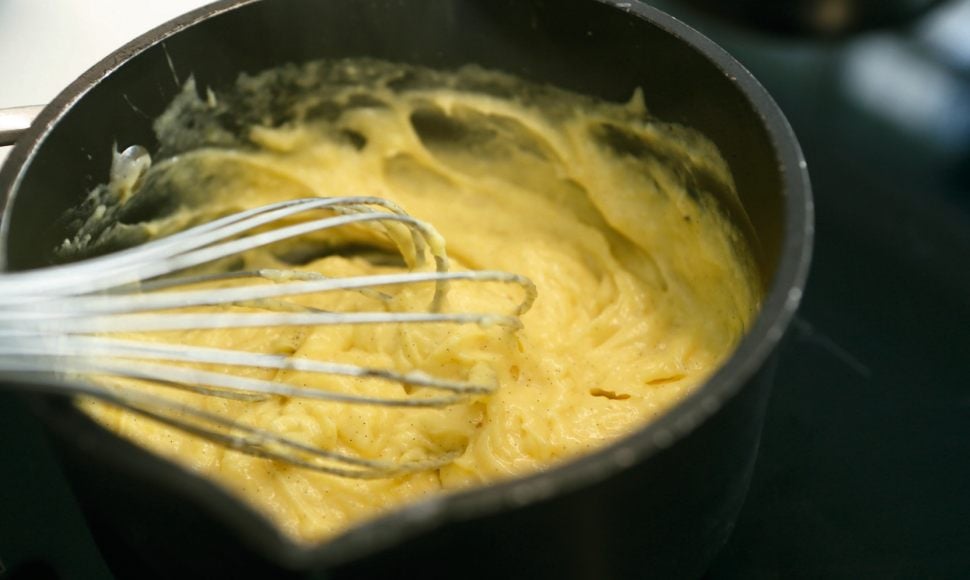 Dans un saladier, mélangez le sucre, la poudre à crème et les jaunes d’œufs. Versez 1/3 du lait vanillé sur le mélange précédent, mélangez, puis reversez le tout dans la casserole.