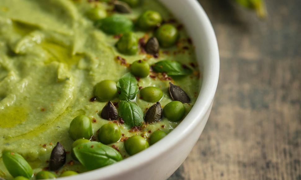 Mixez les petits pois à l’aide d’un blender en y ajoutant la crème et du sel.