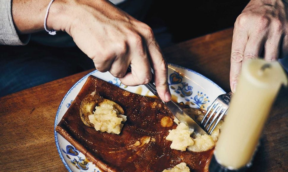Une recette régressive de crêpes pomme-caramel, à réaliser, au choix, avec une pâte au blé noir ou bien une pâte au froment.