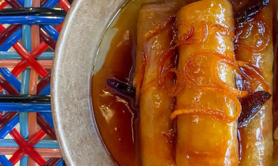 Faire réduire le jus d'orange dans une poêle, ajouter les crêpes roulées, les zestes d'oranges et laisser cuire en les retournant pendant 3-4 minutes.
