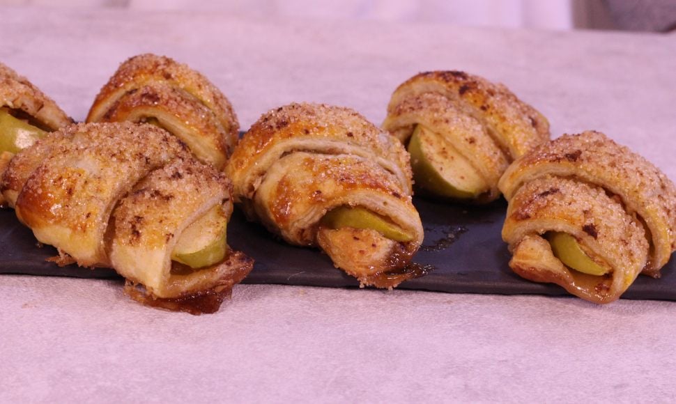 Parfois deux ingrédients suffisent pour mettre un brin de fantaisie à l'heure du petit-déjeuner. Réalisez ces quartiers de pommes enroulés dans des triangles de pâte feuilletée saupoudrés de cannelle !