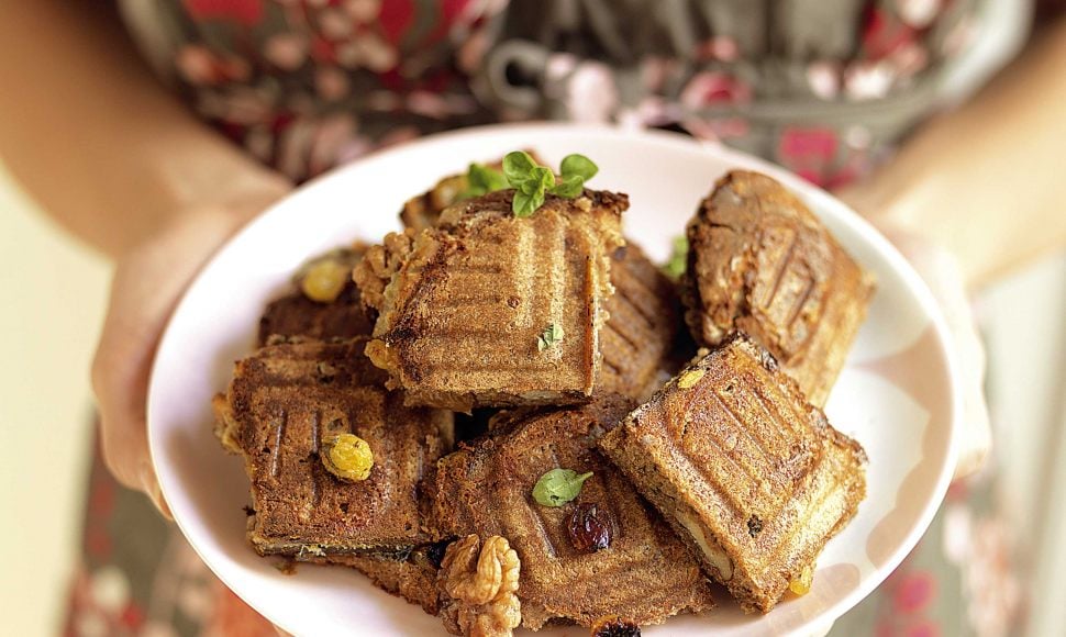 Des petits croque-messieurs sucrés-salés à partager ; au pain de seigle, roquefort, raisins et noix.