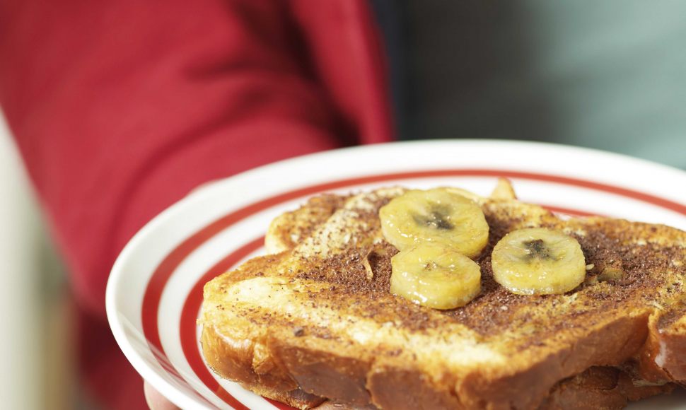 Deux tranches de pain brioché moelleux, abritant une association bien connue banane-chocolat noir.