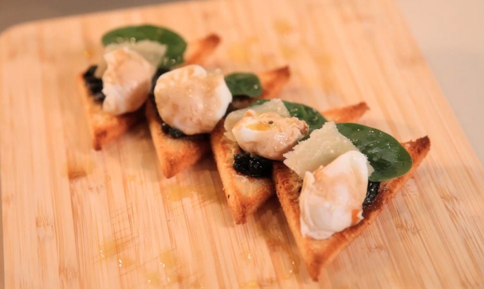 Une entrée croustillante qui ne manque pas de saveur. Sur un crostini au parmesan craquant est délicatement posé un nid d'épinards lui-même serti d'un délicat oeuf de caille. Simple et délicieux, rien à ajouter.