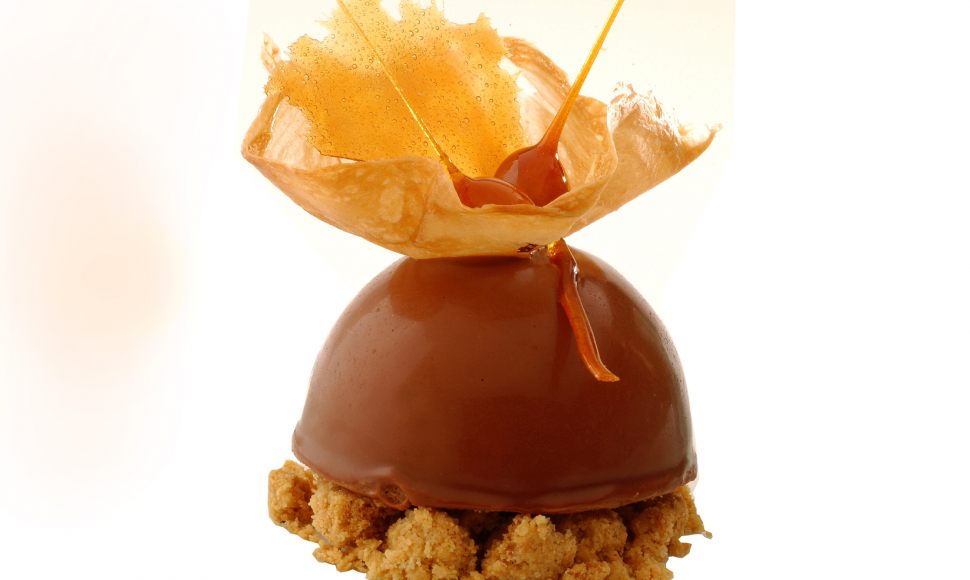 Le mariage chocolat au lait / noisette fonctionne aussi bien dans les barres chocolatées que dans les desserts sophistiqués. Pas à pas, réalisez un dôme de chocolat renfermant une délicieuse glace à la noisette et une mousse au chocolat. Déposez-le sur un croustillant crumble et ajoutez des tuiles de crème pâtissière. Vous n'avez plus qu'à le briser avec votre cuillère pour le savourer.