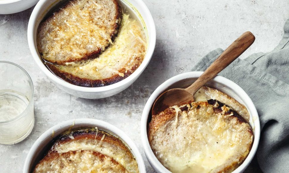 Du pain complet grillé avec du fromage et de la graisse de canard posé sur un bouillon de légumes ou de volaille.