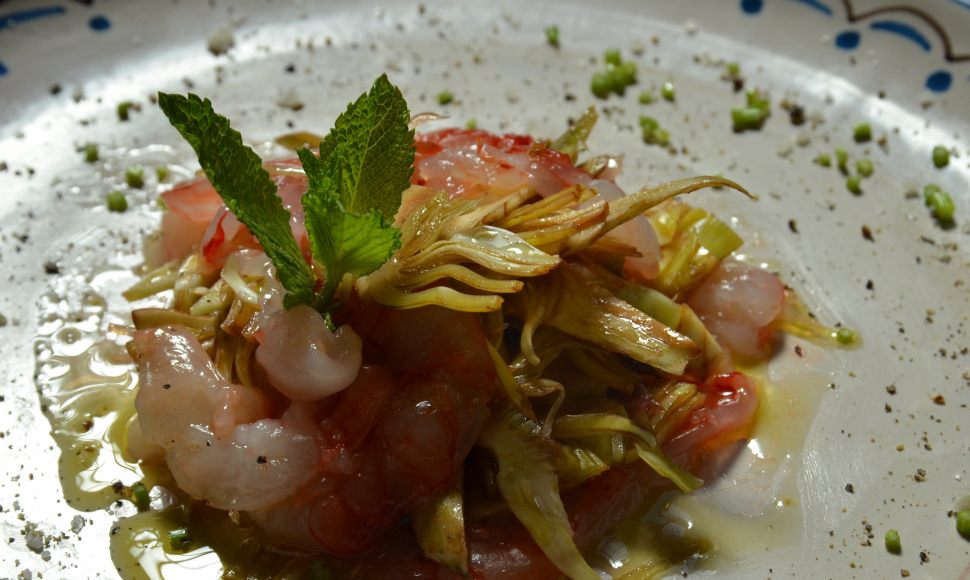 Couper les gambas dans leur longueur puis les ajouter à la préparation des artichauts et mélanger. Répartir la préparation dans chaque assiette et décorer avec les feuilles de menthe.