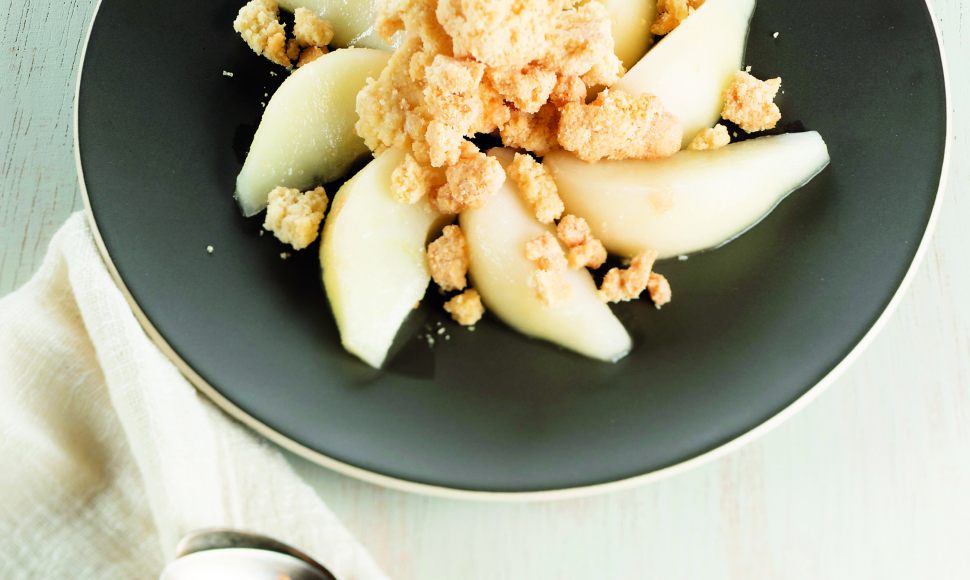 Équeutez et épluchez les poires, coupez-les en deux dans le sens de la longueur, puis videz-les à l’aide d’une cuillère à pomme parisienne. Dans une casserole, mettez l’eau et le sucre semoule, puis plongez les demi-poires dedans. Faites chauffer à feu vif et surveillez. Piquez régulièrement une poire à l’aide d’un couteau d’office. Lorsqu’elles glissent le long de la lame, les poires sont cuites.