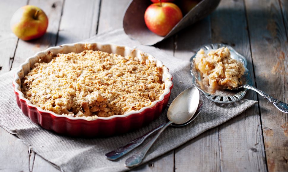 Le crumble est un gâteau d’origine britannique composé d’une couche de fruits et d’une couche de pâte croustillante que l’on émiette sur les fruits. Cette pâte friable explique son nom : en anglais *to crumble* signifie « tomber en miettes ». La recette la plus connue est celle aux pommes, mais les variantes (sucrées comme salées) sont très nombreuses !