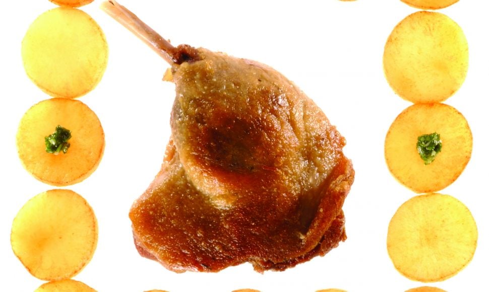 Disposer les cuisses de canard dans un plat, les recouvrir de gros sel, des branches de thym, des feuilles de laurier émiettées ainsi que du poivre concassé. Couvrir de film étirable. Laisser au réfrigérateur pendant 6 heures.