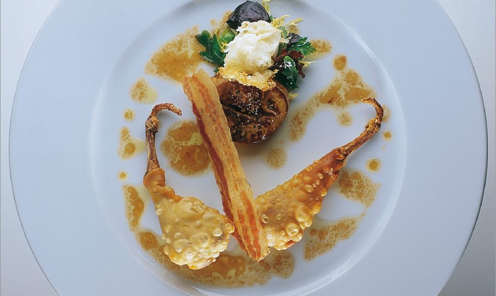 Cuisse de pigeonneau fermier en rissoles croustillantes, lard paysan sur la braise