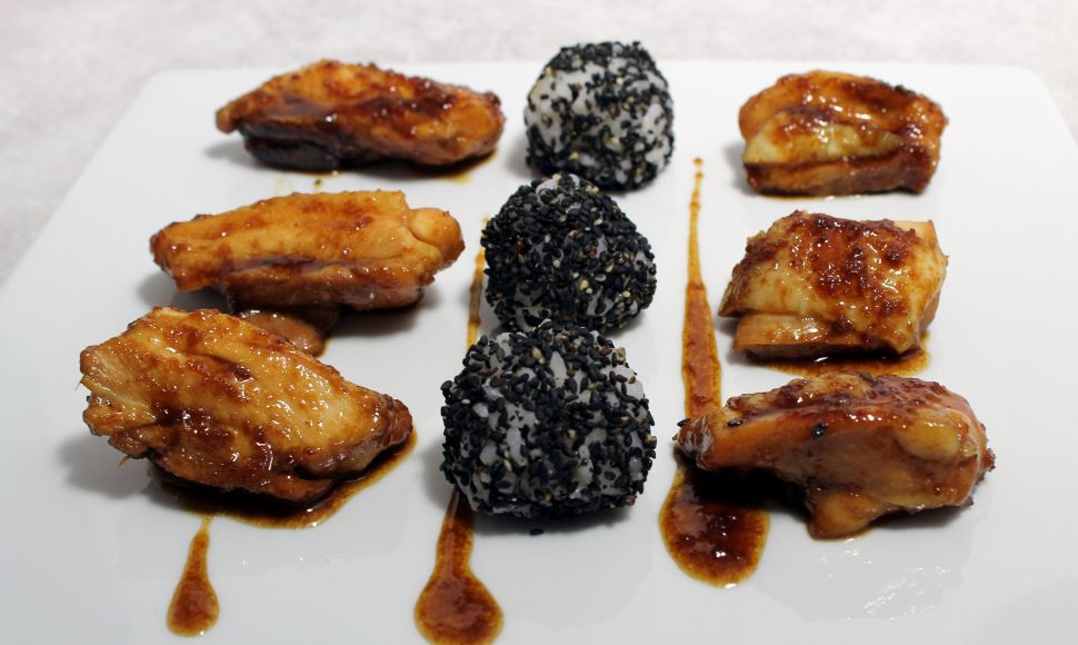 Les cuisses de volaille sont d'abord marinées dans une préparation à base d'huile de sésame, de sauce soja et de gingembre avant d'être laquées en cocotte. Vous allez apprécier leur chair savoureuse salée /sucrée accompagnée de délicieuses petites boule de riz au sésame noir.