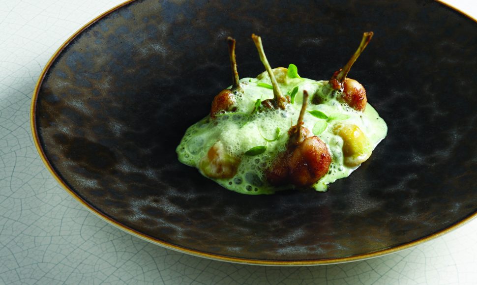 Cuisses de grenouille simplement dorées/cardamome verte/sucs de déglaçage/mollets en fine raviole