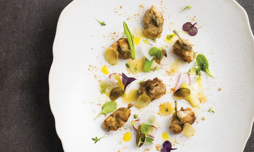 Cuisses de grenouilles troussées et fraîcheur de jeunes pousses, jus au curry vert