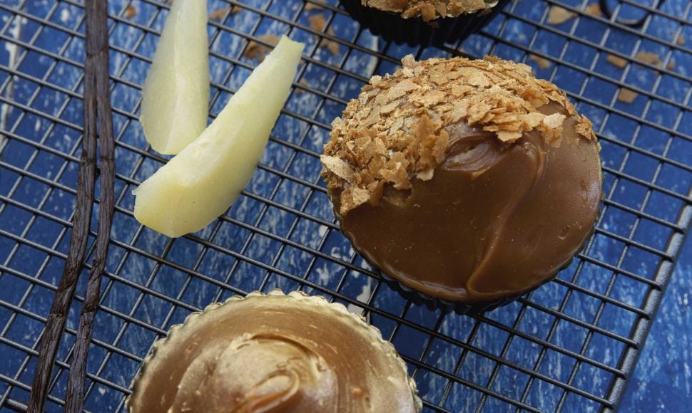 • Réalisez l’appareil à cupcakes comme indiqué en faisant tiédir le lait avec la gousse de vanille fendue et grattée. N’oubliez pas de la retirer avant de mélanger. Pochez 70 g de cet appareil dans chacun des 12 moules à cupcakes, posés sur une grille. Enfournez pour 30 min. Laissez refroidir sur la grille pendant 30 min à température ambiante.