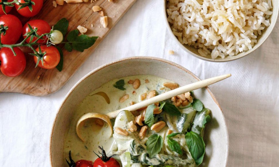 Curry vert au concombre sauté et aux tomates cocktails rôties