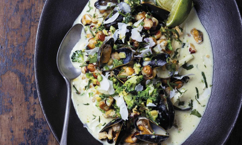 Dressez le tout dans des assiettes, parsemez de coriandre, de zeste de citron vert et de copeaux de noix de coco.
