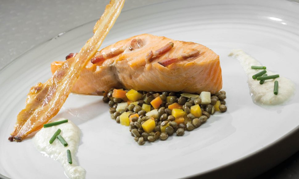Saumon, speck fermier, lentilles vertes, sauce à la bière et au raifort.