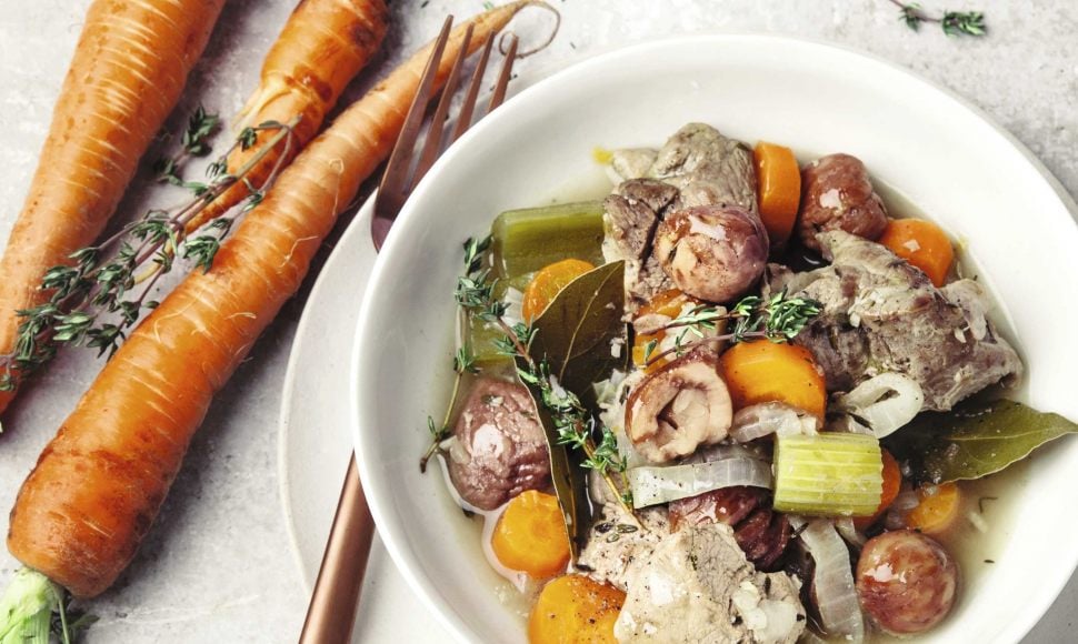 La daube, spécialité de la cuisine provençale, à l'agneau est accompagnée de légumes, de châtaignes et d'un bouquet garni.